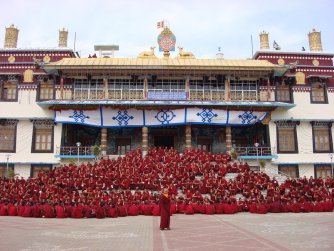 The three major Gelug monastic colleges (Sera, Drepung and Ganden) were recreated in India. The Dalai Lama's current seat is Namgyal Monastery at Dharamshala.