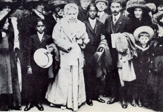Annie Besant arrives in Charing Cross Station, London with Jiddu Krishnamurti, his brother Nityananda, and George Arundale, prominent Theosophist and tutor to the boys, 1911.