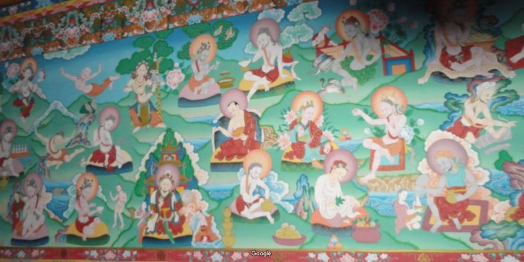 Padmasambahva's eight incarnations in fierce form are also seen here. The painting has scenes of rainbows, with a "whole panoply of Buddhas and Bodhisattvas". This structure was constructed by Dungzin Rimpoche over a period of 5 years.