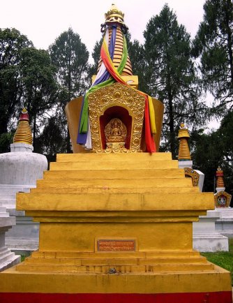The Golden Chorten near Tashiding Monastery. Photo: Dhillan Chandramowli, WIkipedia.From this point ahead is the main 'Tashiding Gompa' which is called as Chogyal Lhakhang or the monastery, followed by the 'butter lamp house', four chortens, 'Tsenkhang', a new butter lamp house and finally terminating at the 'Guru Lhakhang', which is the temple of Guru Rinpoche.