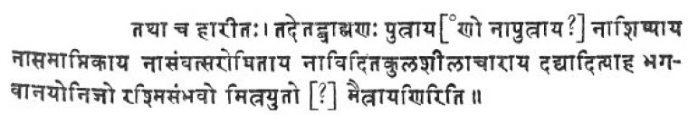 As regards the older works on Dharma, the author of the Institutes of Vasishtha certainly knew and used a treatise, attributed to Yama, the Dharma-sûtras of Manu, Hârîta and Gautama, and perhaps that of Baudhâyana. With respect to two verses, which, as the Sûtra says, were proclaimed by Pragâpati, XIV, 24, 30, it is somewhat doubtful, if it is meant that they have been taken from a work, attributed to Pragâpati, or that they are merely utterances, supposed to have been made by that deity for the benefit of mankind. The latter view seems, however, the more likely one, as it is customary in the Smritis to ascribe the revelation of social institutions, ceremonies, and penances to Pragâpati, who, in the older works, occupies much the same position as Brahmâ, the creator, in the later religious systems. It is not impossible that some of the references to Yama, e.g. XI, 20, have to be explained in the same manner. But other passages, attributed to Yama, e.g. XVIII, 13-26, seem to have been taken from a work which was considered the production of the Dharmarâga. Of course, none of the Yamasmritis, which exist in the present day, can be meant. The quotations from Manu are numerous9. They have all been taken from a book attributed to a Manu, and possess a very high interest for the history of the present metrical Manusmriti. For the prose passage from the Mânava, given IV, 5, furnishes the proof that the author of the Vâsishtha Dharmasâstra quotes from a Dharma-sûtra attributed to a Manu, while other quotations show that the Mânava Dharma-sûtra contained, also, verses, some of which, e.g. XIX, 37, were Trishtubhs, and that a large proportion of these verses has been embodied in Bhrigu's version of the Manusmriti. Fifteen years ago10 I first called attention to Vasishtha's prose quotation from the Mânava, and pointed out that, if the MSS. of the Vâsishtha Dharmasâstra were to be trusted, a small piece of the lost Mânava Dharma-sûtra, on which the present Manusmriti is based, had been found. The incorrectness and the defective state of the materials which I then had at my disposal did not allow me to go further. Since that time several, comparatively speaking, good MSS. of the Institutes of Vâsishtha and many inferior ones have been found, and all, at least all those which I have examined, give the quotation in prose exactly in the same form. The fact that Vasishtha gives, in IV, 5, a prose quotation from Manu may, therefore, be considered as certain11. Moreover several of the best MSS. show, by adding the particle 'iti' at the end of Sûtra 8, that the quotation from the Mânava is not finished with Sûtra 5, but includes the two verses given in Sûtras 6 and 7 and the second prose passage in Sûtra 8. Among the verses the first is found entire in the metrical Manusmriti, and the second has likewise a representative in that work, though its concluding portion has been altered in such a manner that the permission to slaughter animals at sacrifices has been converted into an absolute prohibition to take animal life. Sûtra 8, which again is in prose, has no counterpart in the metrical Manusmriti, as might be expected from its allowing 'a full-grown ox' or 'a full-grown he-goat' to be killed in honour of a distinguished Brâhmana or Kshatriya guest. A closely corresponding passage is found in the Satapatha-brâhmana, and a verse expressing the same opinion in the Yâgñavalkya Smriti, the versification of a Dharma-sûtra of the White Yagur-veda. As the last part of the quotation resembles the text of the Brâhmana and its language is very archaic, it is quite possible that, though belonging to the passage from the Mânava-sûtra, it contains a Vedic text, taken from some hitherto unknown Brâhmana which Manu adduced in support of his opinion. On this supposition the arrangement of the whole quotation would be as follows. Sûtra 5 would give the original rule of the author of the Mânava in an aphoristic form; Sûtras 6-7 would repeat the same opinion in verse, the latter being probably Slokas current among the Brâhmanical community; and Sûtra 8 would give the Vedic authority for the preceding sentences. This arrangement would be in strict conformity with the plan usually followed by the authors of Dharma-sûtras. But whether Sûtra 8 contains a second original aphorism of the Mânava Dharma-sûtra or a. Vedic passage, it seems in-disputable that the author of the Vâsishtha Dharma-sûtra knew a treatise attributed to a teacher called Manu, which, like all other Dharma-sûtras, was partly written in aphoristic prose and partly in verse. The passage furnishes, therefore, the proof for Professor Max Müller's conjecture that our metrical Manusmriti, like all the older works of the same class, is based on the Dharma-sûtra of a Vedic Sûtra-karana. In connexion with this subject it maybe mentioned that the Institutes of Vasishtha contain, besides the above-mentioned passages, no less than thirty-nine verses12, which are not marked as quotations, but occur in Bhrigu's metrical Manusamhitâ. Some of them present more or less important variae lectiones. Moreover, there are four verses which, though Vasishtha attributes them to Hârîta and Yama13, are included in our Manusmriti and treated as utterances of the father of mankind. The bearing of both these facts on the history of the Manusmriti is obvious. But the frequency of the references to or quotations from Manu which Vasishtha makes, teaches another important lesson. Like the fact that Manu is the only individual author to whom Gautama refers14, it shows that in ancient times Manu's name had as great a charm for the Brahman teachers as it has for those of the present day, and that the--old Mânava Dharma-sûtra was one of the leading works- on the subject, or, perhaps, even held that dominant position which the metrical Manusmriti. actually occupied in the Middle Ages and theoretically occupies in our days. It is interesting to 
