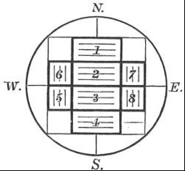 16. In laying down the bricks he again follows the course of the sun, that is, he lays down the four large or central ones from north to south, then the two back ones from south to north, and finally the two front ones from north to south.