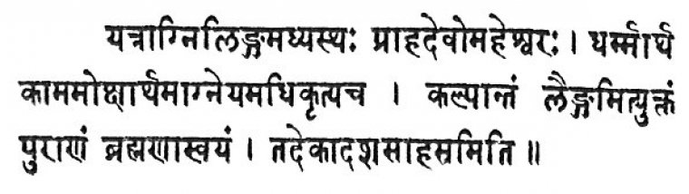 11. Linga Puráńa. "Where Maheśwara, present in the Agni Linga, explained (the objects of life) virtue, wealth, pleasure, and final liberation at the end of the Agni Kalpa, that Puráńa, consisting of eleven thousand stanzas, was called the Lainga by Brahmá himself66."
