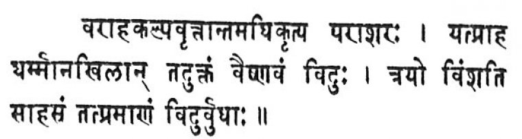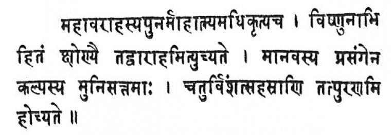 3. Vishńu Puráńa. "That in which Paráśara, beginning with the events of the Varáha Kalpa, expounds all duties, is called the Vaishńava; and the learned know its extent to be twenty-three thousand stanzas41." The third Puráńa of the lists is that which has been selected for translation, the Vishńu. It is unnecessary therefore to offer any general summary of its contents, and it will be convenient to reserve any remarks upon its character and probable antiquity for a subsequent page. It may here be observed, however, that the actual number of verses contained in it falls far short of the enumeration of the Matsya, with which the Bhágavata concurs. Its actual contents are not seven thousand stanzas. All the copies, and in this instance they are not fewer than seven in number, procured both in the east and in the west of India, agree; and there is no appearance of any part being wanting. There is a beginning, a middle, and an end, in both text and comment; and the work as it stands is incontestably entire. How is the discrepancy to be explained?