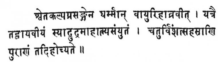 4. "The Puráńa in which Váyu has declared the laws of duty, in connexion with the Sweta Kalpa, and which comprises the Máhátmya of Rudra, is the Váyavíya Puráńa: it contains twenty-four thousand verses42." The Śiva or Śaiva Puráńa is, as above remarked, omitted in some of the lists; and in general, when that is the case, it is replaced by the Váyu or Váyavíya. When the Śiva is specified, as in the Bhágavata, then the Váyu is omitted; intimating the possible identity of these two works. This indeed is confirmed by the Matsya, which describes the Váyavíya Puráńa as characterised by its account of the greatness of Rudra or Siva43; and Balambhat́t́a mentions that the Váyavíya is also called the Śaiva, though, according to some, the latter is the name of an Upa-puráńa. Col. Vans Kennedy observes, that in the west of India the Śaiva is commonly considered to be an Upa or 'minor' Puráńa44.
